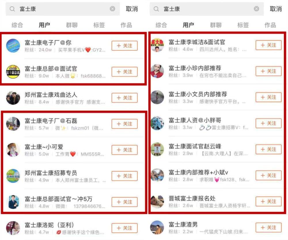富士康粉丝靠前的用户中招聘者众多