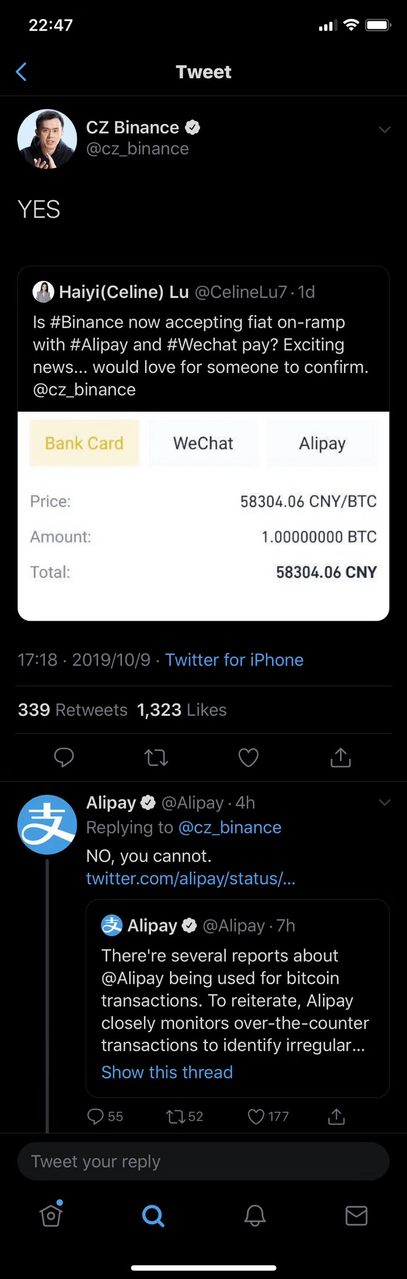 为了强调这一表态,支付宝还远征Twitter,在币安创始人赵长鹏对网友确认可以用支付宝进行比特币交易时回复他:不,你不可以。