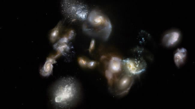 大约15亿年前,在宇宙仅为目前年龄的十分之一时,有14个星系开始彼此纠缠、碰撞,上演了一幕“群雄并起,合纵连横”的大戏,最终形成了迄今已知由引力结合的质量最大的宇宙天体:原星团(Protocluster)SPT2349-56。由引力结合指的是,随着宇宙不断扩张,星系团中星系之间的引力足以克服宇宙膨胀,使各星系得以永远聚在一起。