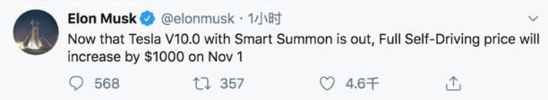 36氪获悉,10月12日,特斯拉CEO埃隆·马斯克在推特表示,由于特斯拉V10.0版本软件和Smart Summon智能召唤功能已发布,特斯拉完全自动驾驶系统的价格将在11月1日上调1000美元。
