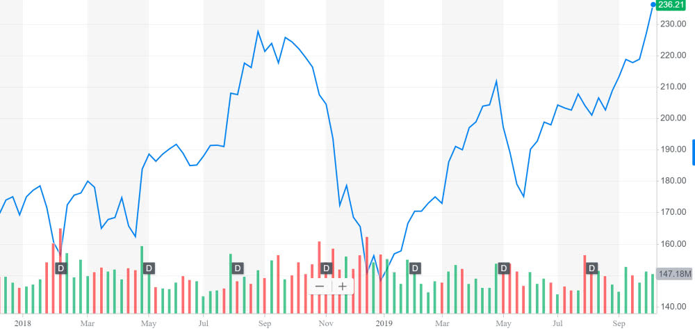 但从今年初开始,苹果股价开始重拾上升动力,尽管中间在5月份遭遇一轮调整,主要受到大盘总体下滑以及中美贸易战负面消息影响,但总体上涨格局在6月份得以重新确立,在进入第三季度后,苹果股价开始呈现出一发不可收拾的上涨态势,在突破万亿美元市值关口后,股价仍然表现出强劲的上扬动力,10月11日盘中创下每股237.64美元的历史新高。