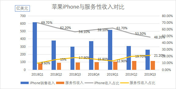 今年开始以来,苹果开始对外讲述另一番故事:基于苹果生态的服务性收入将成为苹果业绩增长的新引擎,无论是在3月初通过一场发布会将苹果包括流媒体视频播放业务在内的内容战略公之于众,还是在9月份最新一代iPhone发布会上,罕见地将与内容有关的发布放到最重要的环节,苹果都将传达这样的故事摆在了最重要的位置,幸运的是,除了通过这些显性的发布会来强调转型之外,苹果的财报业绩数字也对外明确地传达了这样的信号:苹果的业务结构转型,确实已经取得了阶段性成果。