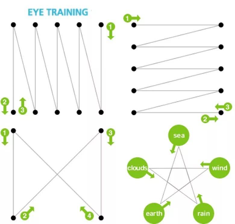 第六课,眼睛训练。眼球跟着箭头方向运动,脑子里想象着地球上的风、雨、云、海的运动。它可以扩大你的视野并增强一目十行的能力!理论上此时应该能听见风雨大海的声音。