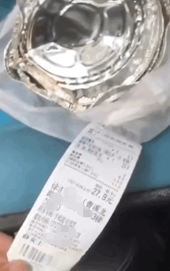 视频镜头里系一个锡箔纸包装的餐盒,并有一个外卖订单。