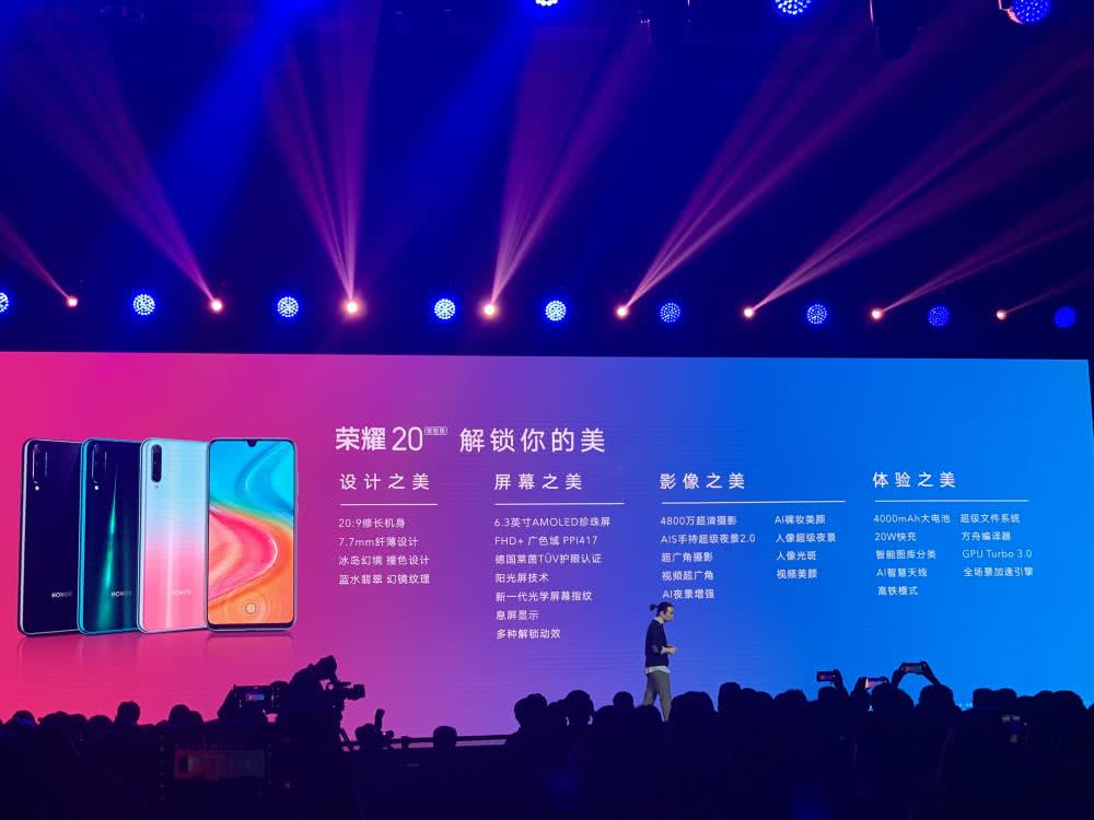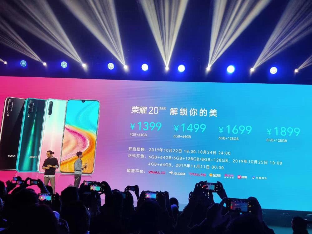 10月22日,荣耀在北京发布荣耀20青春版手机。荣耀20青春版拥有冰岛幻境、蓝水翡翠、幻夜黑三种配色,售价1399元起。
