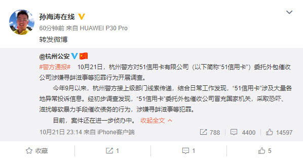 杭州公安局官方微博21日晚间通报称,10月21日,杭州警方对51信用卡有限公司(以下简称51信用卡)委托外包催收公司涉嫌寻衅滋事等犯罪行为开展调查。51信用卡遭警方调查