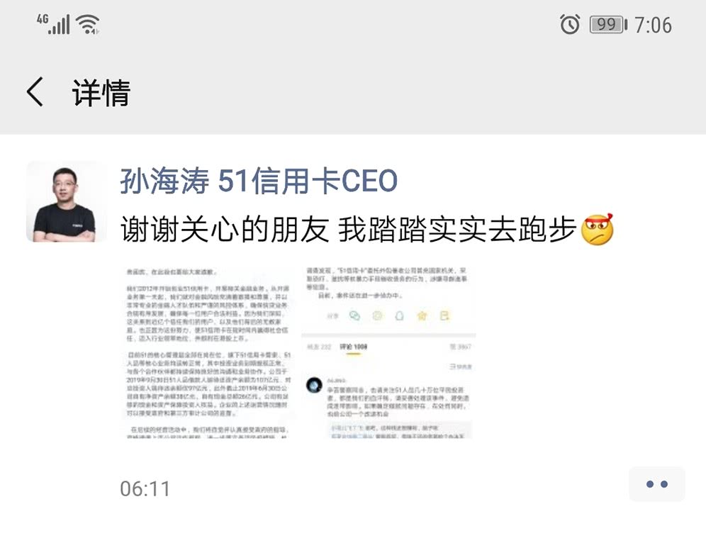 大家好,我是51信用卡的创始人兼CEO孙海涛。昨日公司配合调查一事,引起了大家的关注,也给社会舆论带来了不好的影响,对此我们非常的自责。在此我和51信用卡全体管理层向大家表示诚挚的道歉。这个风波是因为我们管理上的不完善,尤其是对合作公司的培训和监督不够,导致在对借款人联络沟通过程中出现了一些过激的行为,给个别借款人造成了伤害,为此我们非常抱歉。此事也引起了51信用卡员工和家属们的担心,特别感谢每位51信用卡人的付出,因为我们的工作不到位给大家造成了一些困扰,在此我也要给大家道歉。
