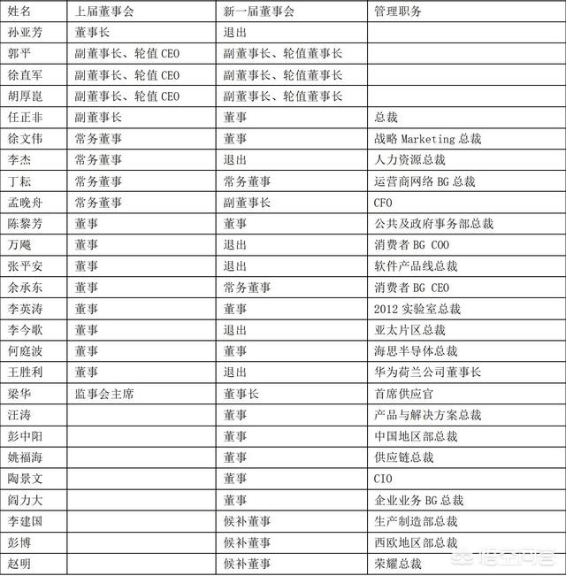 华为是一家规模巨大的公司,现在华为实行的是轮值CEO制度,现在华为的董事会拥有20名董事,这20名董事还分别担任有其他职务。下面来看一下。