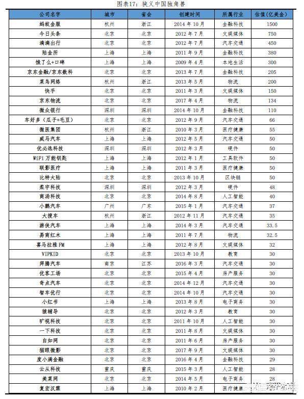 根据公含义,独角兽是值达到10亿美元未上市的初创企业。由于独角兽企业大都集中在互联网、金融等领域,因此独角兽企业往往代表着新经济的活力,行业的大趋势,国家的竞争力。美国和中国是全球独角兽企业最集中的两个国家,独角兽企业数量合计全球的七八成。在我国,北上深杭是我国独角兽最集中的四大城市。