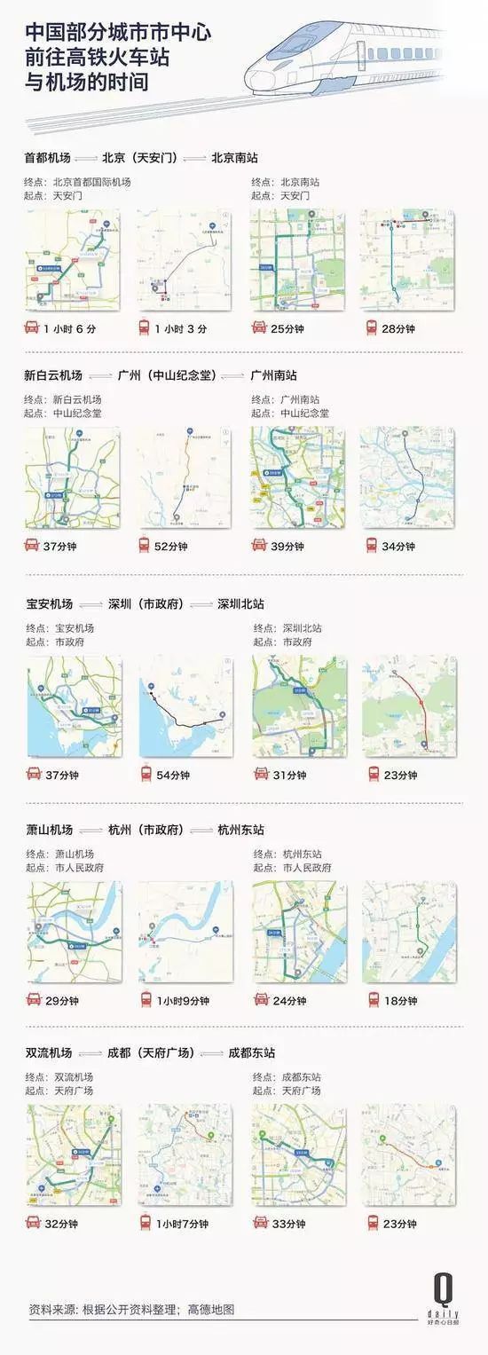 试想,假如你住在东三环双井附近,准备去上海,坐公共交通前往首都机场需要花费55分钟左右,加上需要提前1小时抵达机场,在起飞之前至少需要预留两小时。飞行时间1小时40分,排队下飞机之后,你花在路上的总时间大约为4小时。相对于大多数城市的机场,北京首都机场距离市区已经是很近了,上海虹桥机场更是和虹桥火车站挤在一起。