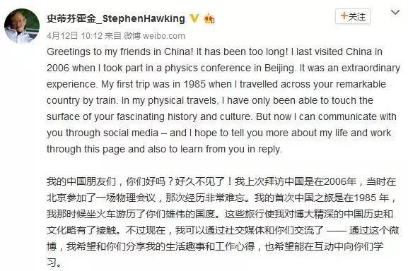 还在中国开通了微博,扛起了科学界头号网红的大旗~
