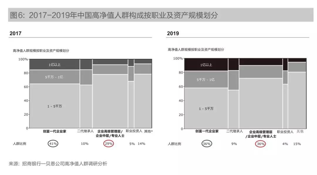 调研数据显示,2019年企业高级管理层、企业中层及专业人士占全部高净值人群的比例由2017年的29%上升为36%,首次与创富一代企业家群体看齐。二代继承人、职业投资人占全部高净值人群的比例均较2017年有所下降,分别为9%和4%。