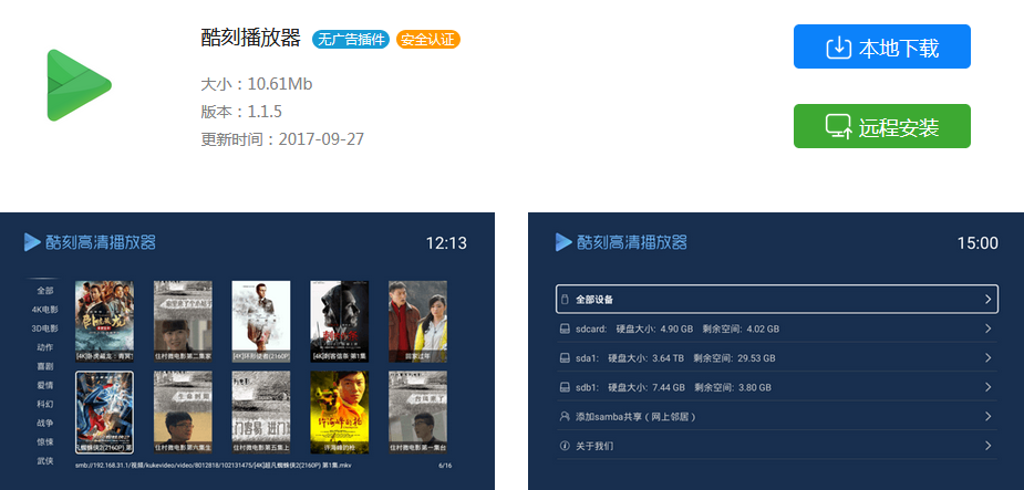这是一款可以播放高清电影的专用播放器,支持主流视频格式,支持高码流解码。支持samba(网上邻居)共享内容的读取及播放,支持硬盘内容读取和播放,支持主流视频格式的检索及播放。