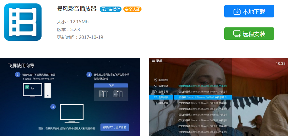 风影音播放器TV版是专为智能电视和安卓电视盒子打造的本地视频播放应用程序。1.万能播放,暴风更专业,支持硬解+,硬解,软解3种解码模式,什么视频都能播。 支持内嵌、外挂字幕,支持多音轨切换。2.飞屏技术,连通您的电脑和电视,直接播放电脑中存储的视频,电视大屏看片更爽。3.dlna投屏,在线视频大屏看。有了暴风TV版,其它设备上的视频都能投屏到电视上看了。