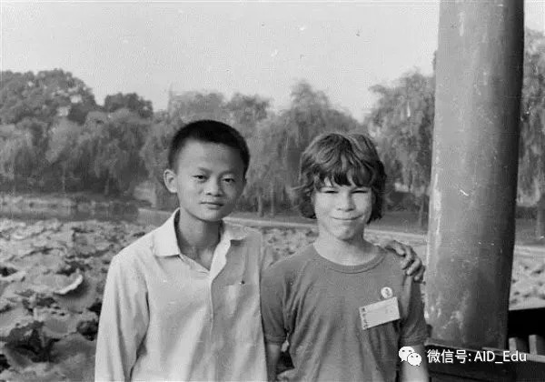 15岁的马云和他新认识的澳大利亚小玩伴戴维•莫利摄于西湖边。戴维胸前佩戴着澳中友好协会旅行团的证件。