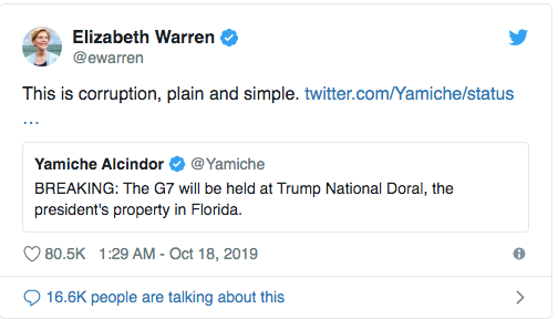 民主党总统候选人伊丽莎白·沃伦在推特上就G7峰会举办地的决定说:“这是贪腐,清晰又简单。”