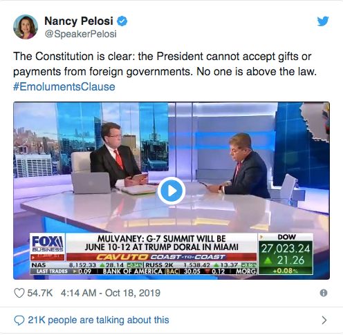 美众议院议长佩洛西在推特发文称,宪法很明确:总统不能收取外国政府的馈赠和报酬。没有人可以凌驾于法律之上。
