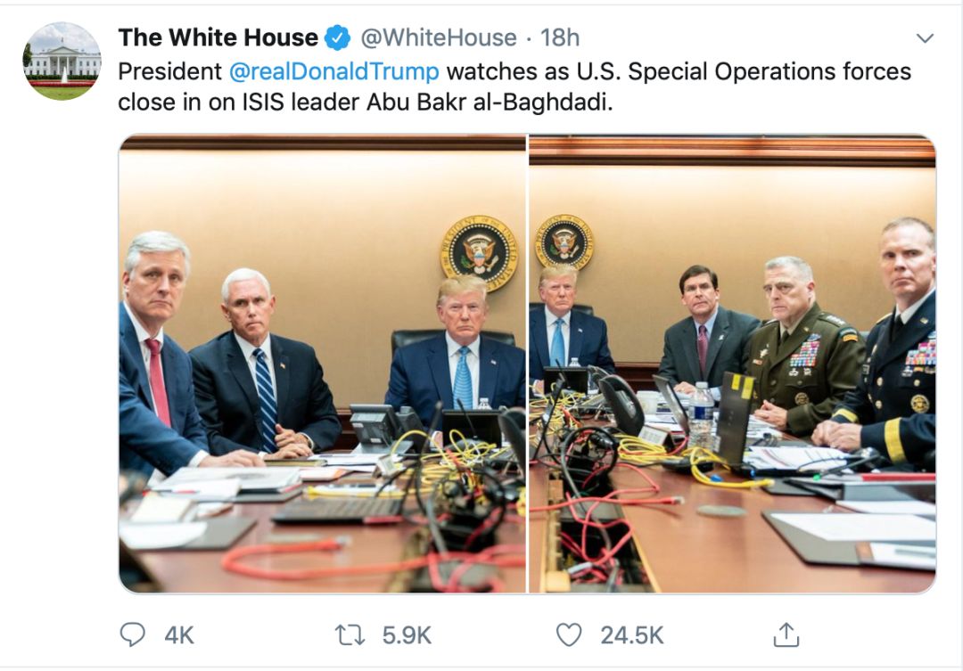 美国白宫方面27日公布了两张照片,显示特朗普和副总统彭斯、几位高级国安顾问坐在白宫战情室内,观看了26日晚美军针对巴格达迪的突击行动。