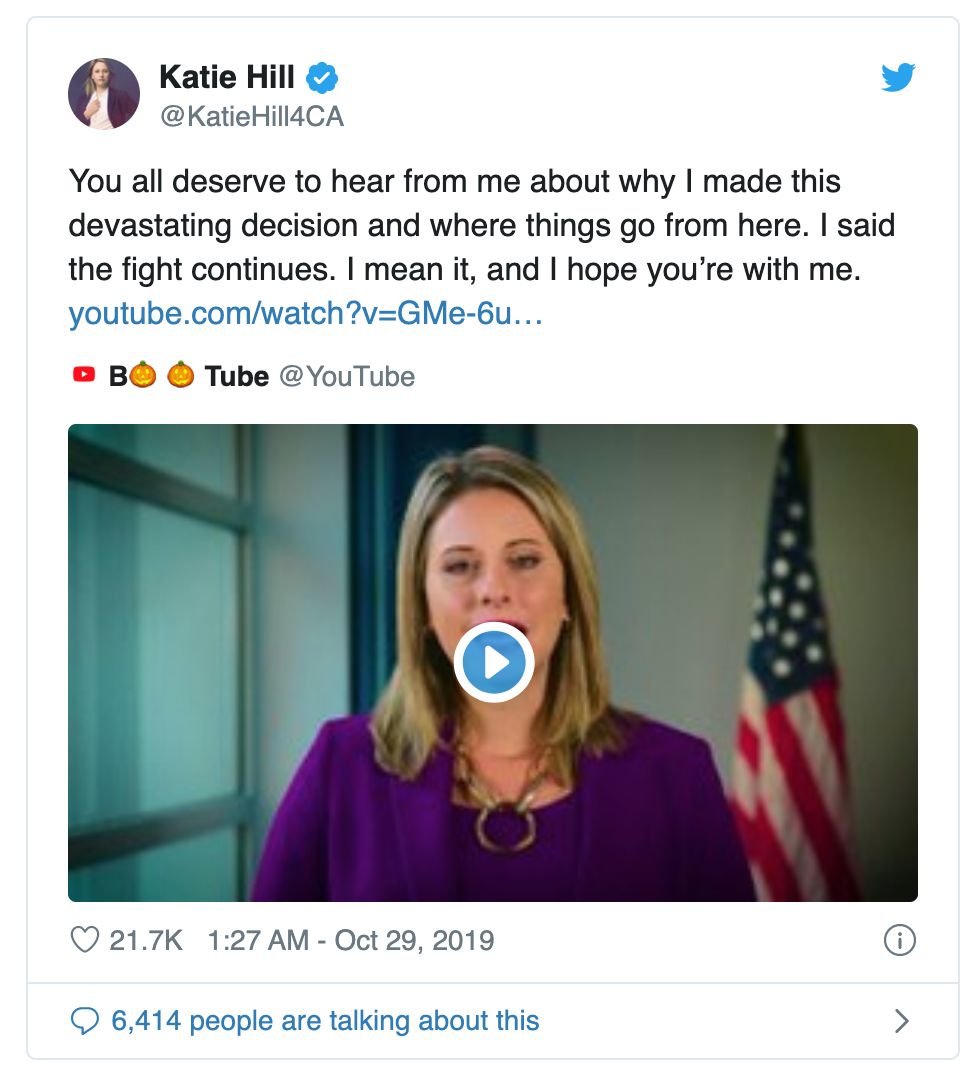 现年32岁的凯蒂·希尔原本是民主党一名冉冉升起的政治新星,她在2018年的美国中期选举中成为20名赢得众议院席位的千禧一代的一员,击败共和党候选人成功成为南加州25区的代表。