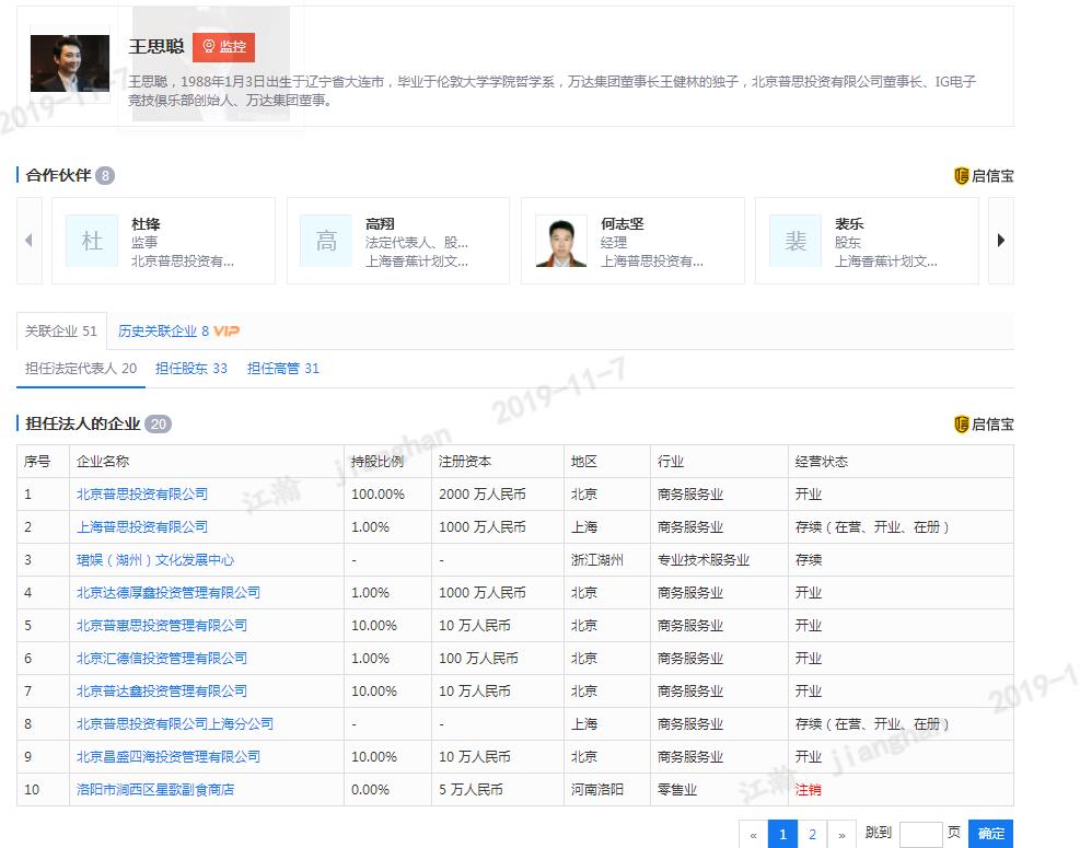 其次,我们再来说王思聪的问题,王思聪之前曾经被人报料,拿了五个亿去创业,如果创业成功了,王思聪就可以不听老爸的,不用回家继承家业,如果创业失败就需要乖乖回家继承万达。这次王思聪被成为被执行人,虽然王思聪并没有本人有什么回复,但整体来看,王思聪这些年所投资的企业基本上都是处于一个比较好的状态,根据启信宝的数据,王思聪在20家公司担任法定代表人,在33家公司担任股东,在34家公司担任高管,对108家企业拥有实际控制权。对于风险投资,其实很多人都知道只要风投企业中有10%能够成功就代表这个风投已经做得非常好了,所以虽然王思聪有一些项目出现了问题,比如说大家常说的熊猫,但是从整体来看王思聪的投资还是非常不错的,像英雄互娱也是可圈可点的成功案例。