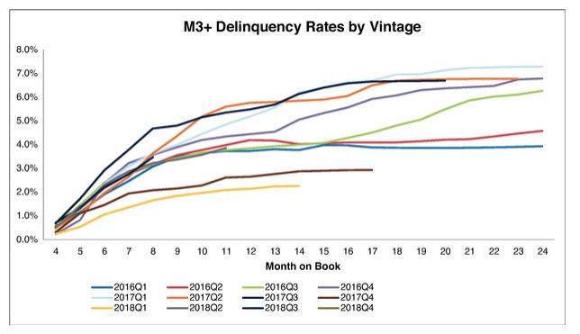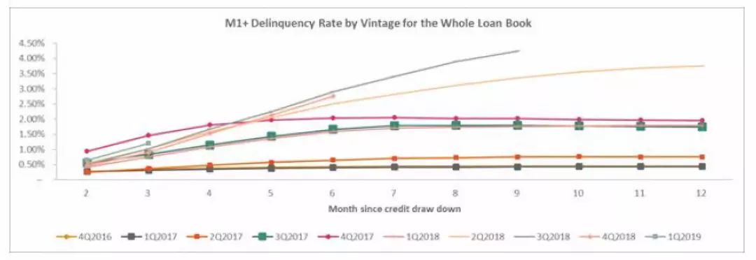 上图中,2017年Q1发放的贷款违约率接近7%,与趣店不同的是,2018年几个周期的贷款在一定周期内违约率并不明显,甚至要低于其他周期的数据。