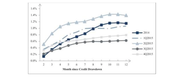 其一,2014-2015年正处于快速增长势头,总贷款量呈几何倍增加,违约期尚未到来,且借贷总规模的增长有利于稀释违约率数值,趣店IPO时声称其违约率仅有0.5%以此证明模式由于银行业,就此看也是不客观的;