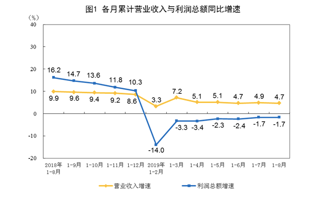 在统计总局最新公布2019年1—8月份全国规模以上工业企业利润下降1.7%,其中营业收入增长4.7%为历史低点,见下图