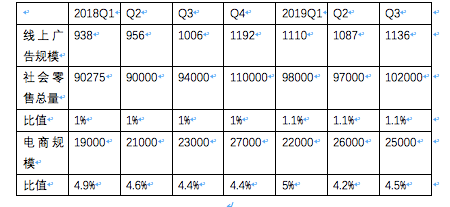 根据国家统计局和第三方公司数据,我们整理了2018年Q1-2019年Q3的线上广告总规模与线上零售总额以及社会零售总规模的数据对比,见下图