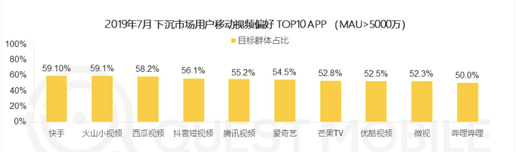 在QuestMobile的《2019移动互联网广告营销半年报告》中,披露了下沉用户移动视频偏好TOP的APP,其中并未见到好看视频。