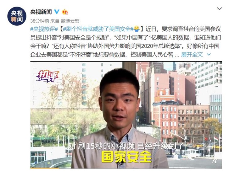 央视热评还表示Facebook、Twitter等在对待有些中国问题上可谓是双重标准玩的溜,对于严格审查是应该的,但如果因为抖音是一个中国企业开发的应用就“想着方的制造麻烦,那真是无聊的浪费时间”。
