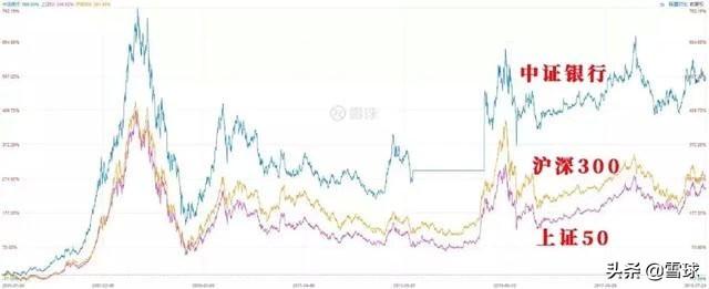 上图是中证银行、上证50和沪深300指数自2005年至今的走势对比。