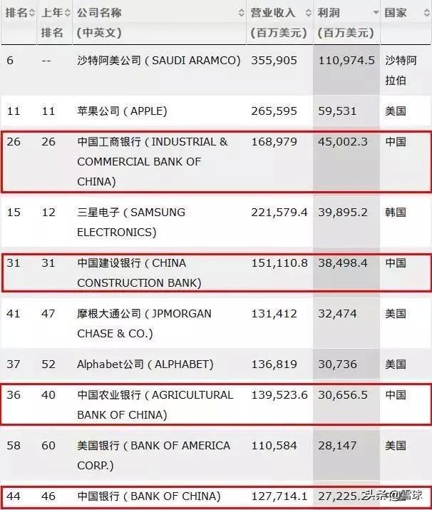 工农中建四大行更是全部进入利润榜前十位,四大行一年利润合计1414亿美元,接近万亿人民币。