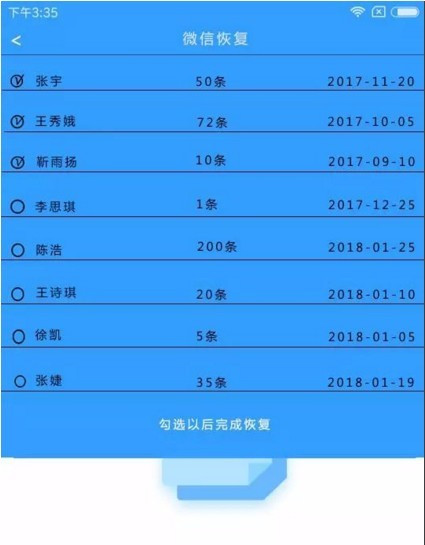 (6)等待小程序扫描完成之后,【勾选】出需要恢复的微信聊天记录,再【确认】恢复即可。