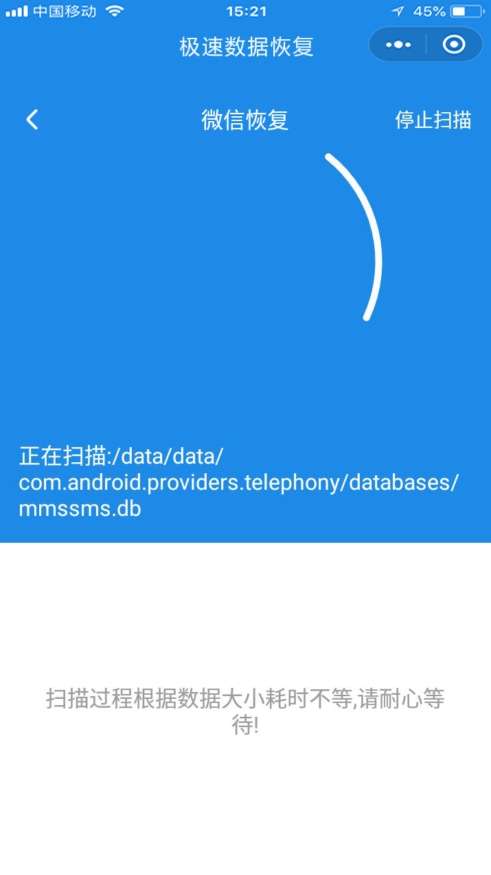 (5)这里我们选择【微信恢复】为例。点击【微信恢复】之后,小程序自动进入扫描的页面;