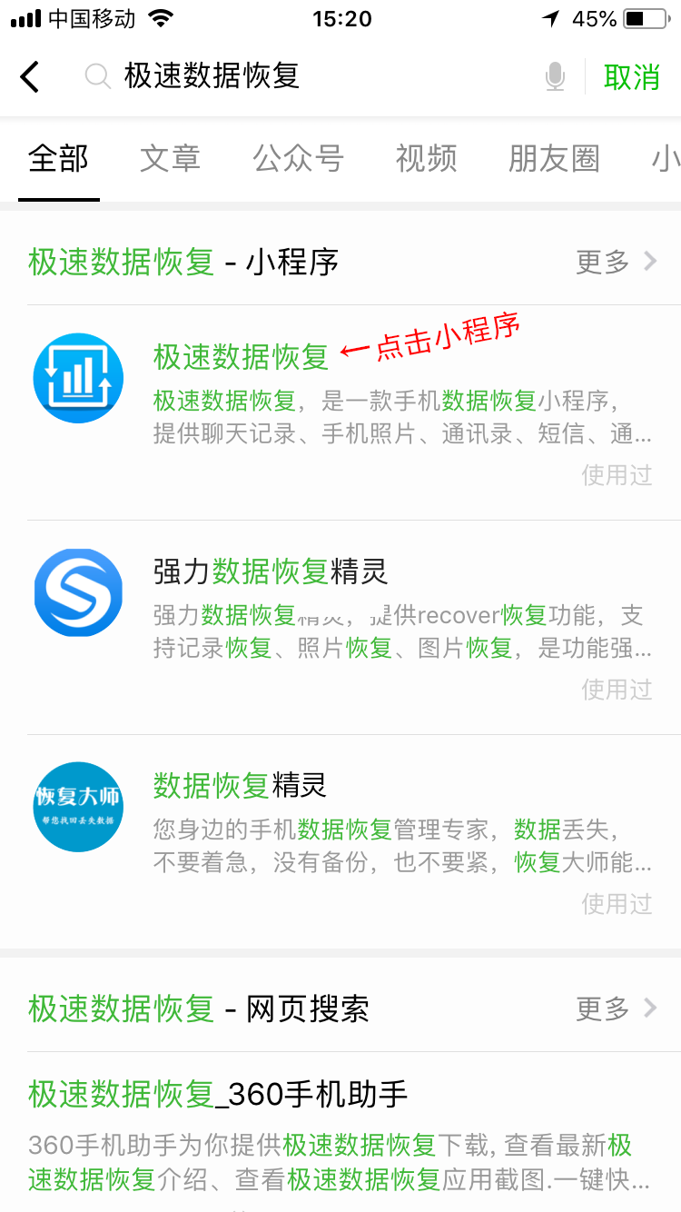 (2)点击【小程序】,在右上角的【搜索】框中搜索:极速数据恢复;
