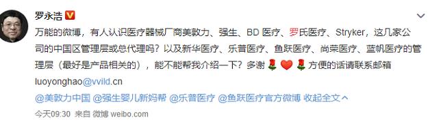 这样推测是有依据的。这个“老人与海黑科技发布会”公众号的主体,是“北京善洁卫康科技有限公司”,而其公司主页中也可以看到发表过《仿生微结构皮革新材料对细菌的作用》这样的论文,并且有“抗菌涂层材料技术专利”。另外罗永浩最近经常在微博中发“求助信息”,而最新的一条透露出想要认识医疗行业的公司和人脉的意图。
