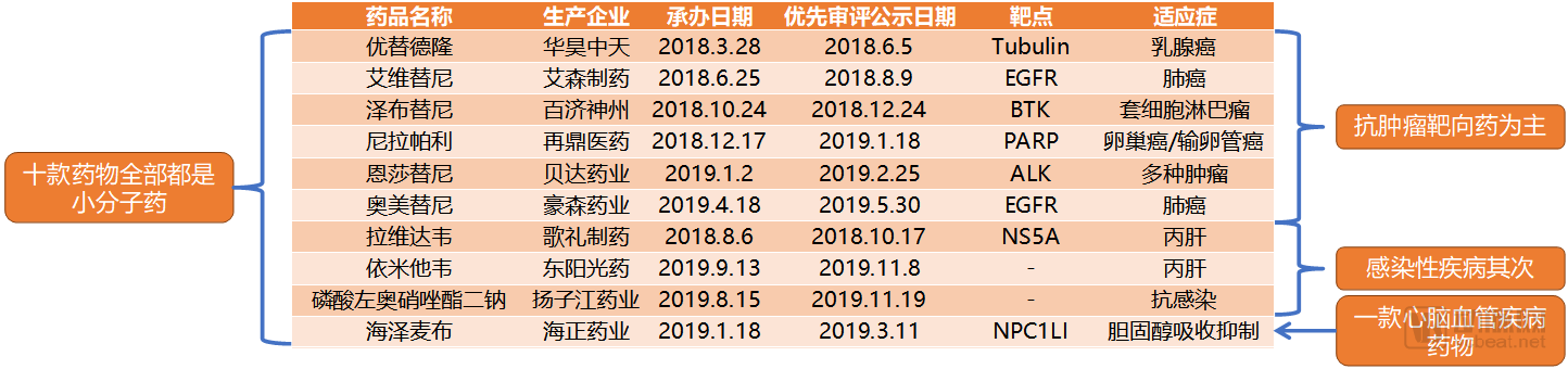 2018-2019年十几款国产创新药上市之后,留在优先审评队列里的国产创新药正在变得越来越少。我们从优先审评名单中梳理出的或将在2020年上市的十款国产创新药全部是小分子药,国产大分子创新药则在PD-1单抗悉数完成NDA之后暂时归于平静。