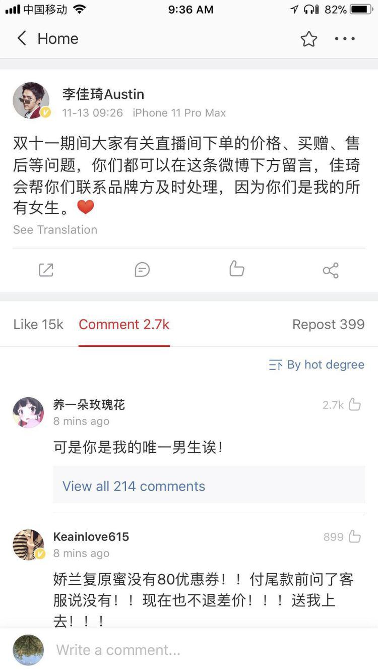 在双十一前后这个多事之秋,粉丝对李佳琦前所未有地表现出了包容与支持。11 月 13 日,李佳琦为大闸蟹事件道歉的同一天,微博 " 李佳琦反黑组 " 成立,该账号发布的第一条内容,就是:所有女生,保护我方李佳琦。