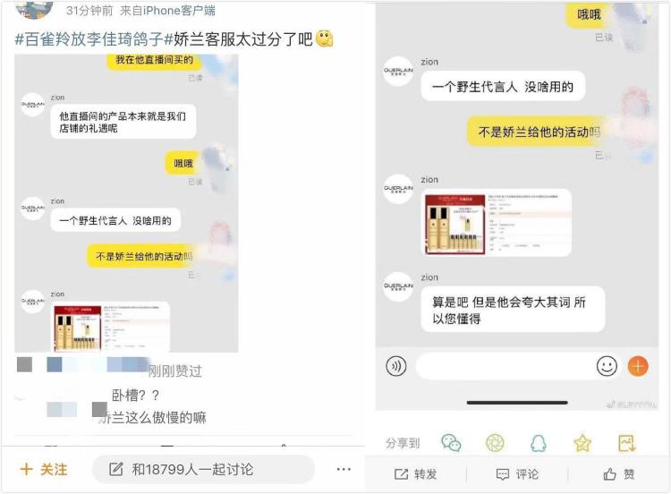不久前,同样是法国娇兰,一段网传客服对话截图显示,法国娇兰客服在回应顾客关于李佳琦的问题时,出现了诸如 " 一个野生代言人 "," 他直播间的产品本来就是我们店铺的礼遇 "," 他会夸大其词 " 等等表述。