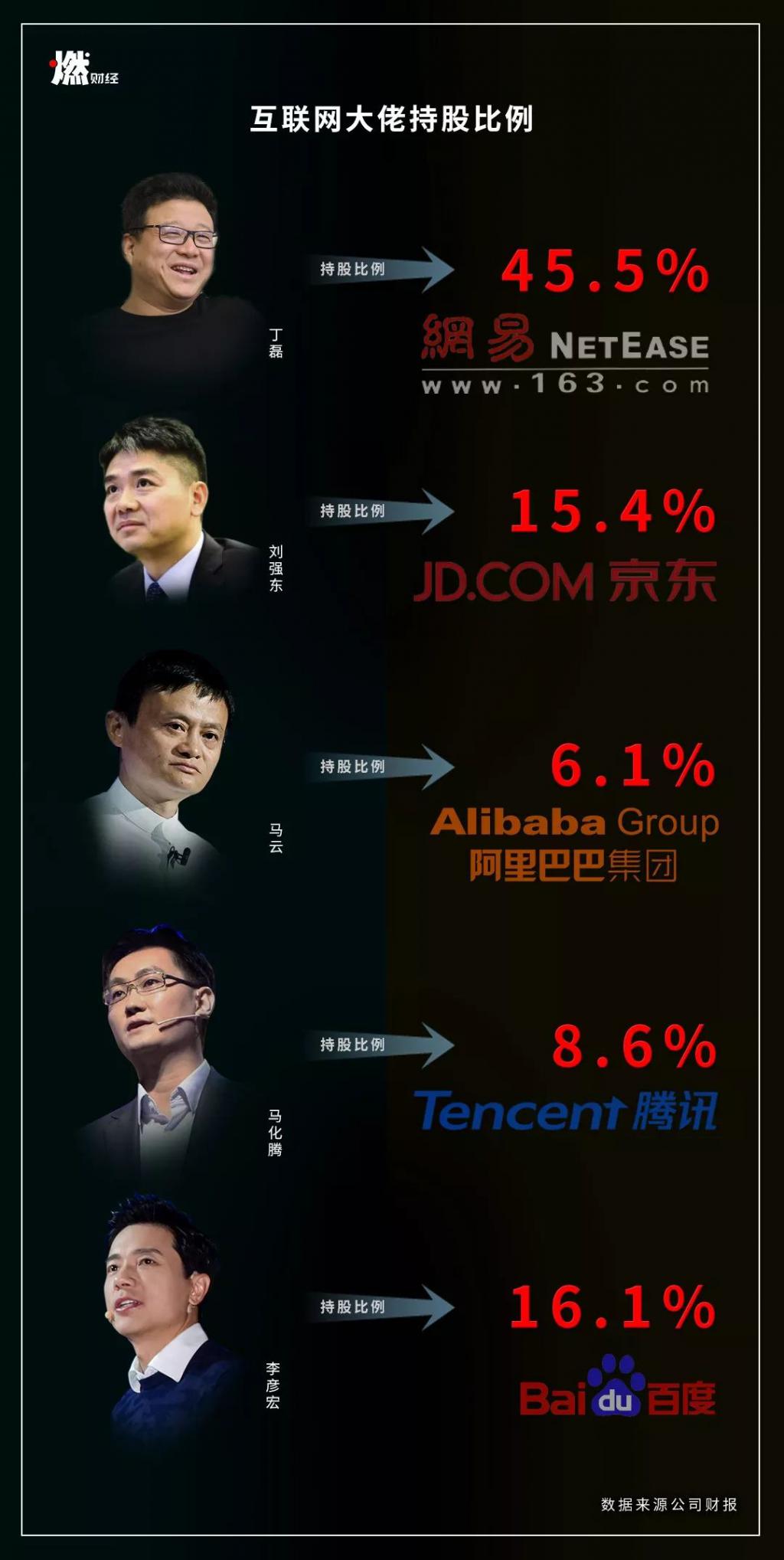 少有人知的是,截至 2018 年 12 月 31 日,丁磊在网易的股权比例,高达 45.5%,这是他财富来源的基石。相比之下,马云持有阿里巴巴的股权为 6.1%,马化腾持有腾讯 8.6%,李彦宏持有百度 16.1%,刘强东持有京东 15.4%。所以,即便中国互联网城头变换大王旗,丁磊屹立不倒。这是他自己的公司。