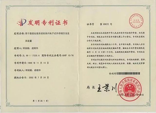 1999年11月14日,邓国顺与成晓华申请了U盘专利,即ZL99117225.6号“用于数据处理系统的快闪电子式外储存方法及装置”发明专利,在2002年获得了国家知识产权局正式授权,朗科成为了第一个获得U盘专利的公司。随后,两位专利申请人分别向美国、欧洲、日本、香港等国家和地区提交了专利申请。