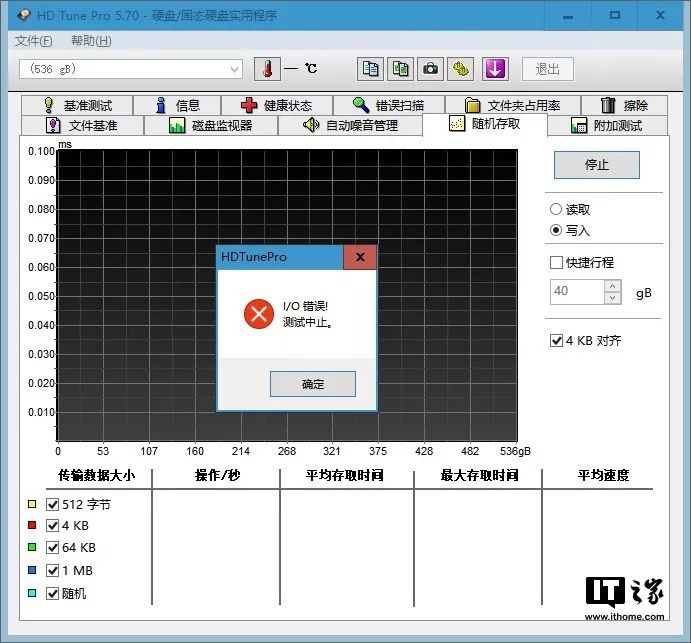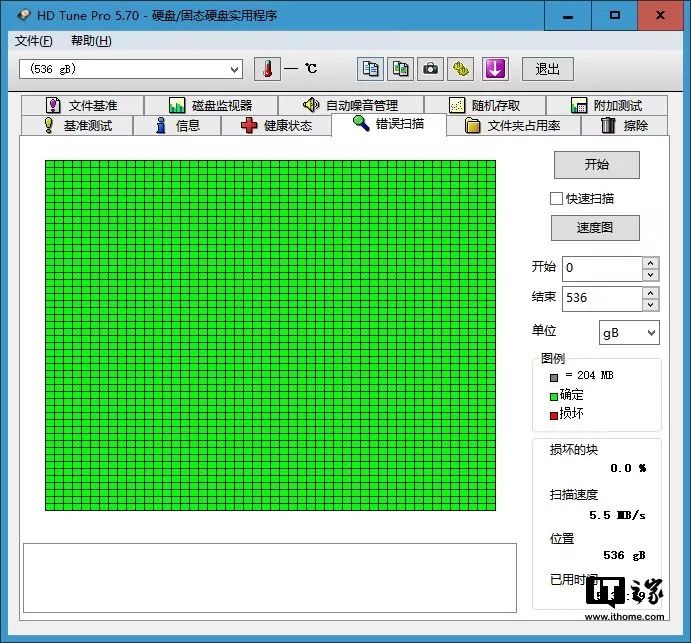 “随机存取”检测,“读取”结果我没看出什么,不过“写入”结果却报错了。而漫长的“错误扫描”,也毫无收获。