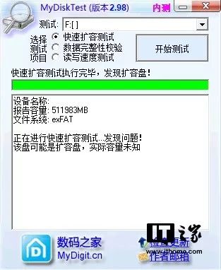 找出一个常用的扩容盘鉴定工具“MydiskTest”,对U盘进行快速扩容测定。结果提示“可能是扩容盘,实际容量未知”。