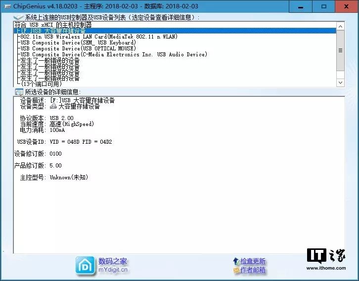 既然疑似扩容盘,只要知道主控品牌,使用对应的量产工具进行U盘量产,就可以知道它的庐山真面目了。于是我使用了主控检测工具“ChipGenius”,对U盘主控品牌进行加测。然而,结果却是“主控型号未知”。