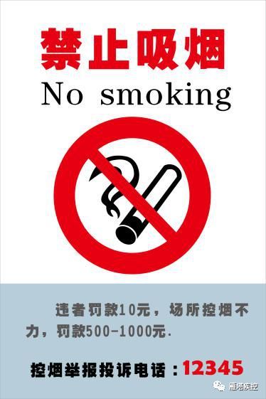 1. 通用禁烟标识为在本市禁止吸烟基本图形警示标识基础上,标注中英文“禁止吸烟 No smoking”、“控烟举报投诉电话:12345”和“违者罚款10元,场所控烟不力,罚款500-1000元”,见图2。