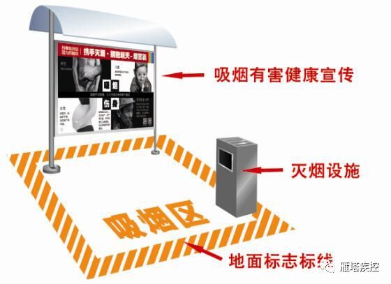 2.吸烟区引导标识:在禁止吸烟区域张贴的吸烟区引导标识应包含“此处为禁止吸烟区域,吸烟请到××处”,“吸烟危害健康Smoking is Hazardous to Health”等字样。吸烟区引导标识可根据实际环境自行设计制作。