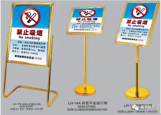 1.标识大小:各款禁烟标识长宽比例规格要符合各款式的要求,具体印制尺寸不限,可以根据各场所的大小按模板要求放大或缩小,不得随意变更基本图形警示标识的配色。