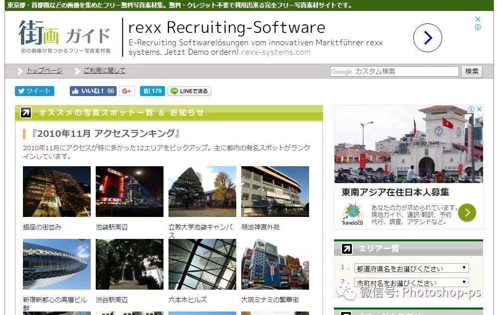 「街画ガイド」(街头相片指南)是一个日本免费图库,以收录日本几个大城市街景为主,包括东京、横滨、大都会区、大阪、京都、关西等地区,这是一个相当完整的免费照片数据库,所有相片皆可免费下载并自由使用于商业或非商业用途,无须标示出处。