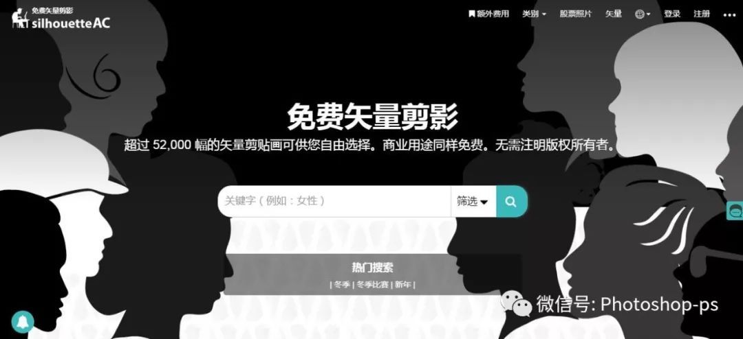 SilhouetteAC 是一个来自日本大阪的免费矢量图图库,主要以收录剪影(Silhouettes)为主,SilhouetteAC 免费图库一共收录超过 47,000 张剪影向量图片,完全免费!可自由使用于个人或商业用途,不用标示出处来源,也无需额外注册账号。SilhouetteAC 提供的图片格式包括 JPEG、PNG 和向量图 EPS 格式。重点是,它也有中文!