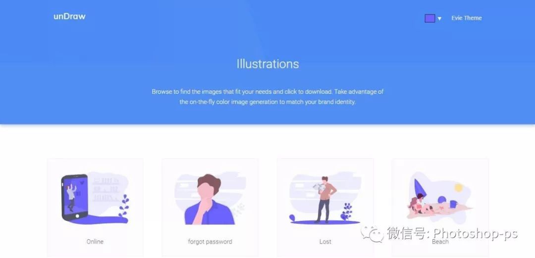 unDraw 是一个很棒的扁平化设计图库,以收录插图为主,这些图案设计很有质感,原作者 Katerina Limpitsouni 仍持续不断更新中,免费下载 SVG 或 PNG 格式,无需标示出处,亦能用于商业用途(网站采用 The MIT License 授权方式)。值得一提的是 unDraw 可以在线直接调整插图的主要颜色!